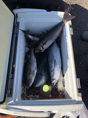 ルアー釣り。アカハター30㎝、1尾。ネイリー45㎝、1尾。ハマチー45㎝~60㎝、10尾。スマカツオー45㎝、1尾。