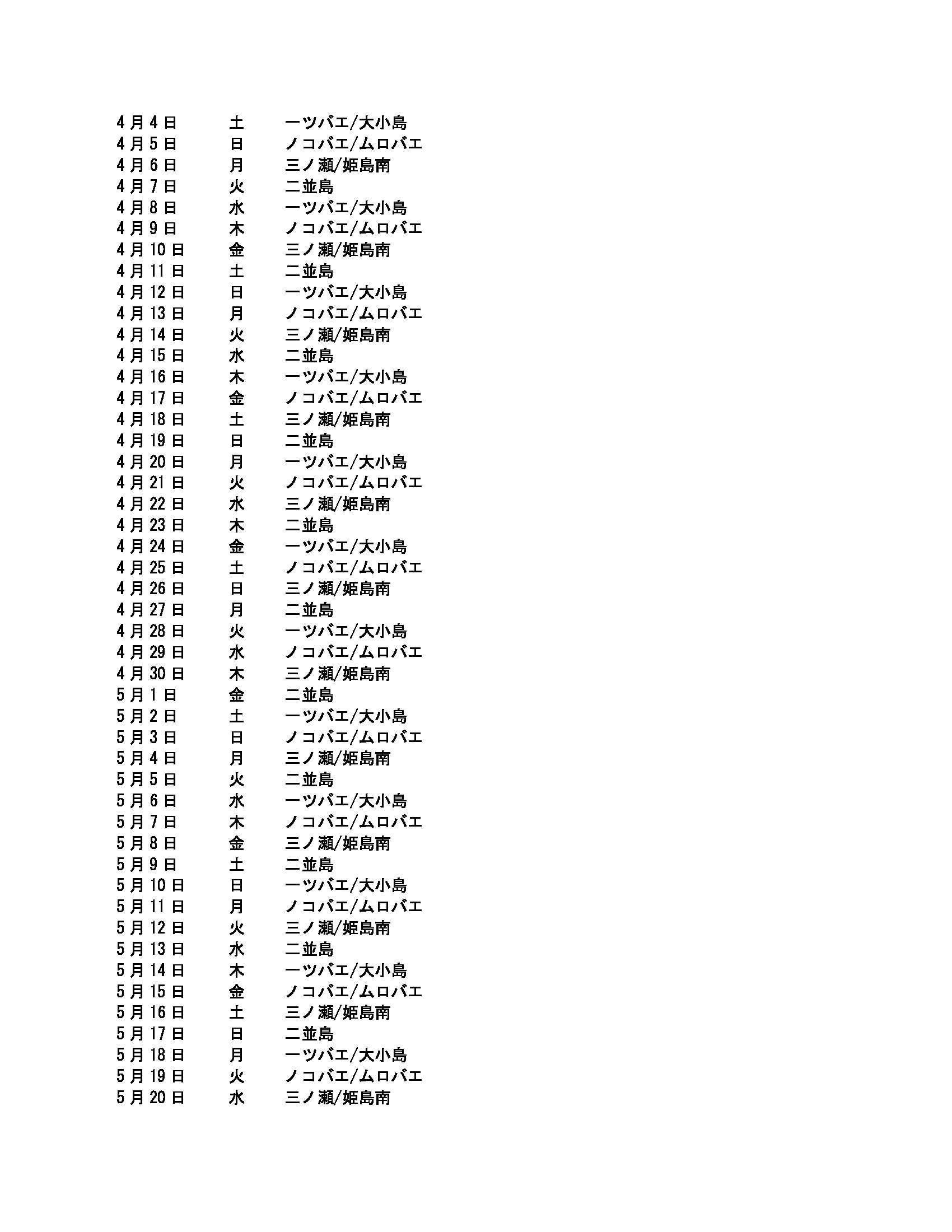 磯割り表(澤近渡船)